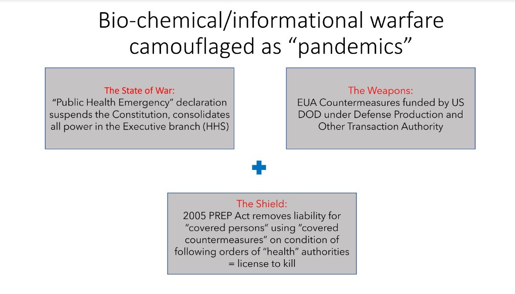 Katherine Watt uncovered the most important piece of the puzzle I was looking for – the US laws that have been systematically put in place over the decades by the planners of the covid atrocity. The law is the most important evidence of planned democide, the evil acts committed by the military-intelligence-“biodefense” global crime cartel, i.e. Public-Private Pandemic-Preparedness Partnerships. Law making happens to be a series of intentional acts. If they resulted in mass death and horrific injuries – then that was the intent!